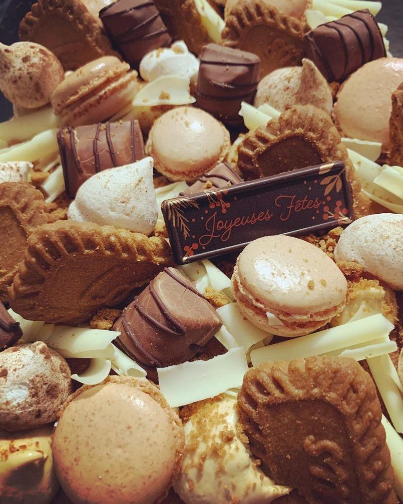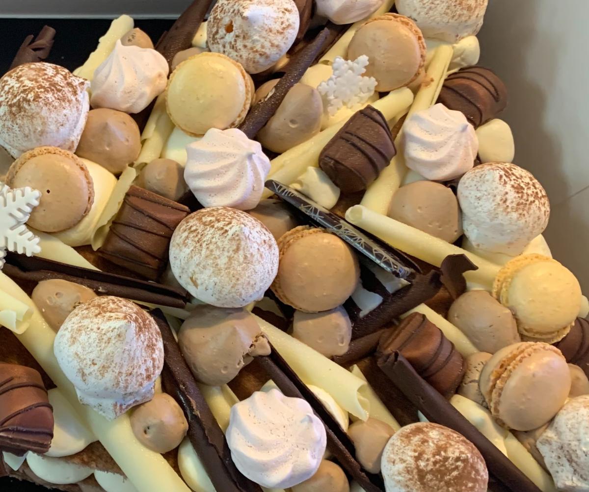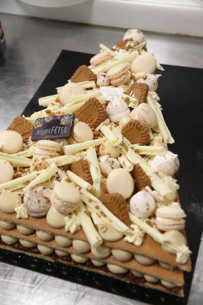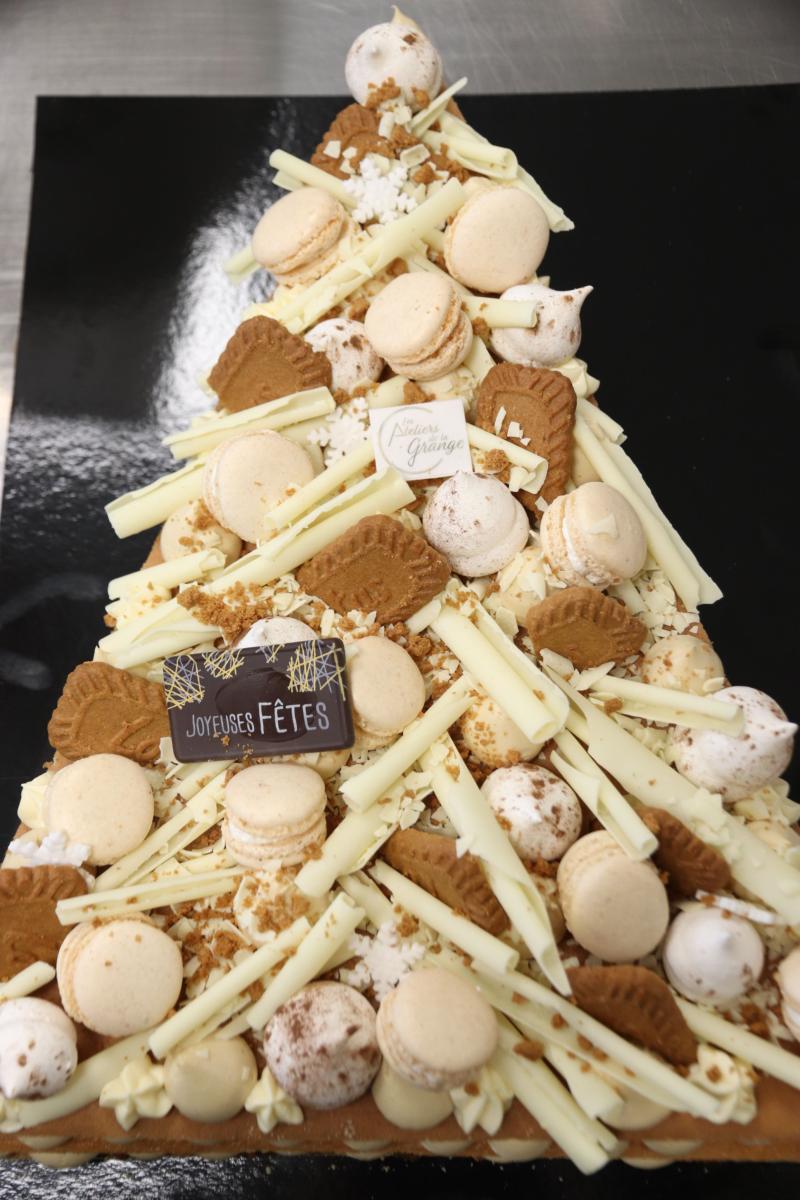Il prend la forme d'un sapin décoré de meringues, de macarons, de brisures de spéculos pour 12 personnes.