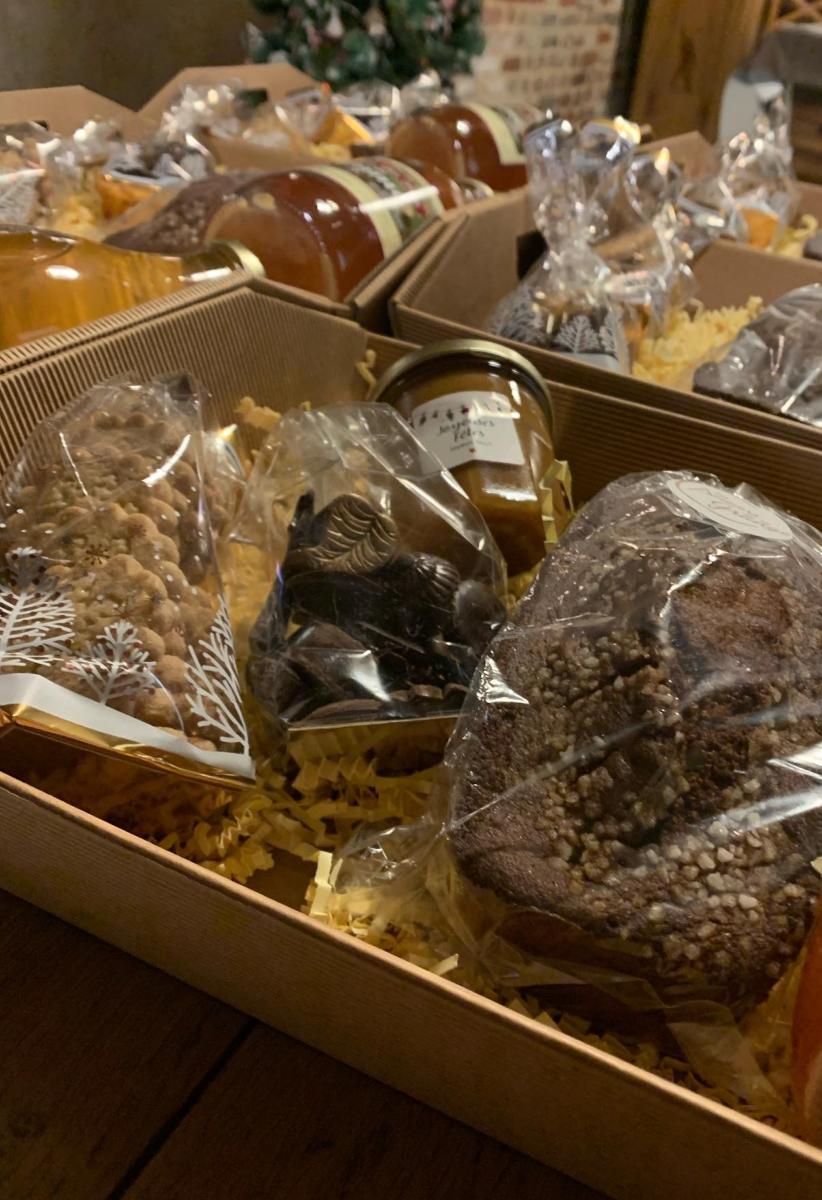 Le coffret des Ateliers est composé d'un pain d'épices 300g, d'un sachet de truffes au chocolat 100g ( ou d'une boite de 7 macarons ), d'un sachet de sablés 200g, d'un sachet de meringues 50g, d'un pot de caramel au beurre salé et un pot de confiture ( 2x12.5cl ).